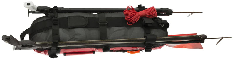 Red for excellent visibility, it uses two casings: an outer skin made of abrasion-resistant material ensures excellent protection for the two inner inflatable chambers, which are white. A mesh cover makes the bottom abrasion-proof and ensures effective drainage so that the buoy retains its light weight at all times. The upper part is fitted with multipurpose pockets and a big expanding container. A mesh bag made of adjustable elastic straps will carry additional objects. A zipper along the center gives access to the two air tubes, which are kept separate for fail-safe buoyancy. A casing for the pole of the flag required by regulations is provided in the center of the front section of the float. Also Red, the line is about 20m long and is fitted with two plastic snap hooks. This buoy comes with a convenient whistle: an additional safety device.