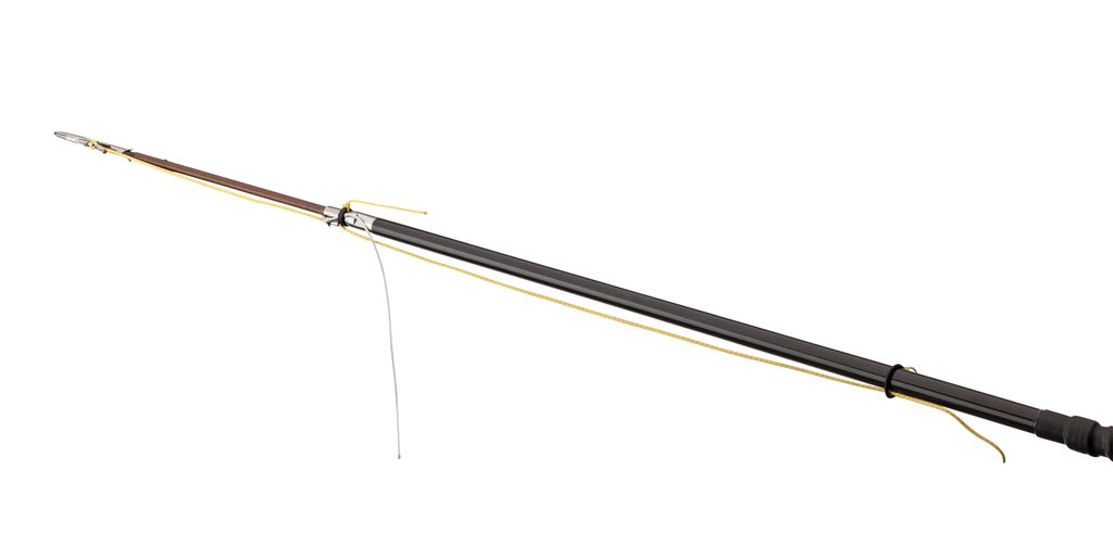 All hardware is made with 316 marine grade S.S. The front and rear sections are tapered for speed and maneuverability. Each section of the hollow carbon fiber rod is plugged with epoxy and sealed air tight for use at any depth. The S.S. fittings add needed weight for punch and include heavy-duty connection shoulders to eliminate wobble.